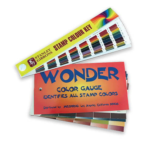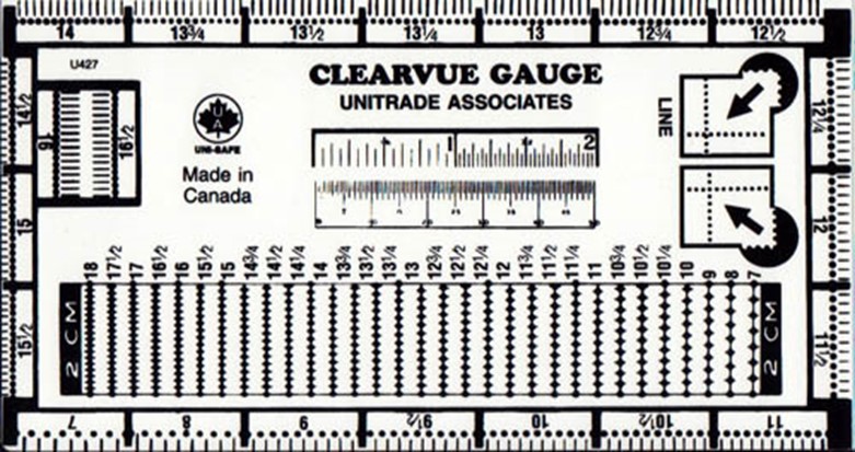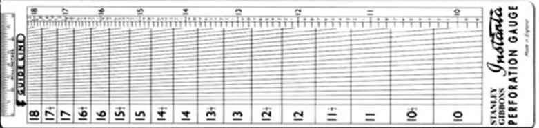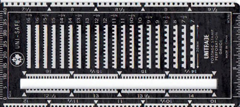 Clear plastic gauge measures stamps to perf. 18. Millimetre and inch scales also on gauge.