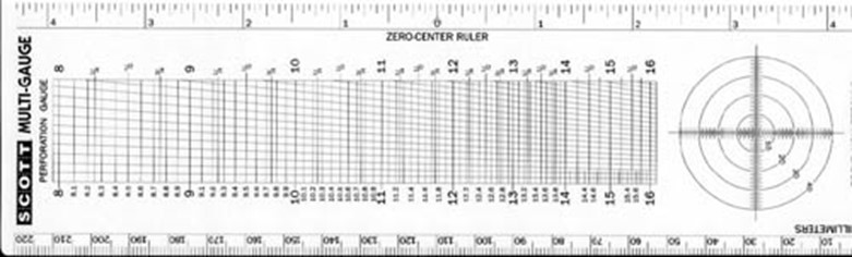 4 in 1 instrument. Perforation gauge, millimetre ruler, cancellation gauge and zero center ruler.