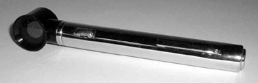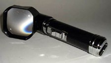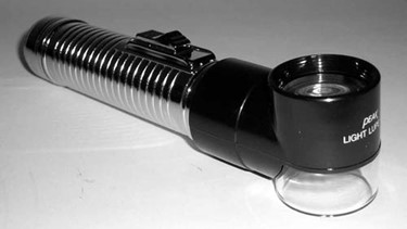 The bulb can be rotated to aim light directly at the object to be viewed. Uses 2 AA batteries. Comes complete with carrying case.